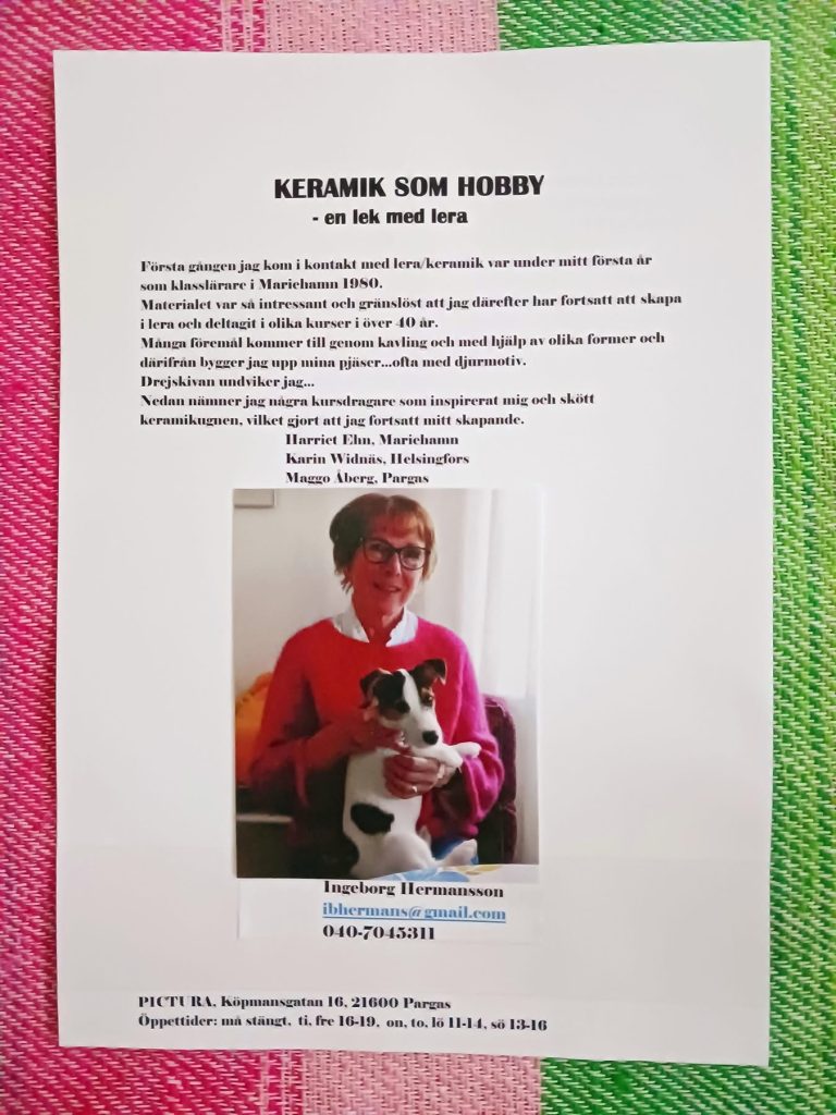 Kombi i Pargas har kurser inom flera konstområden, t ex måleri och keramik. Nu ställs en del av läsårets arbeten ut i konstföreningens Picturas regi i Galleriet, Köpmansgatan 16 i Pargas.