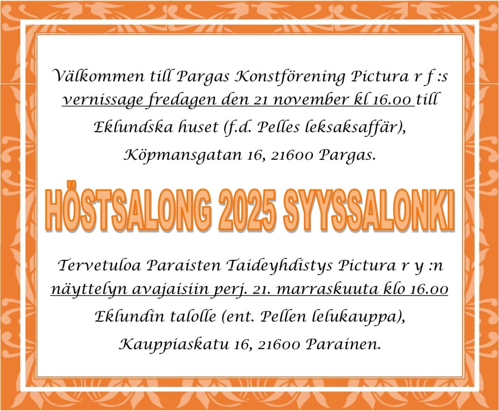 i Migliore, Köpmansgatan 18, är tillgänglig för Picturas medlemmar enskilt mot en liten avgift, fram till 17.5.2025. Passa på att boka in dig! Eller titta in någon onsdag eftermiddag, då vi har öppet kl. 14 – 17 för målarträffar eller fri samvaro.